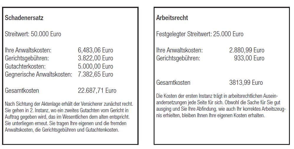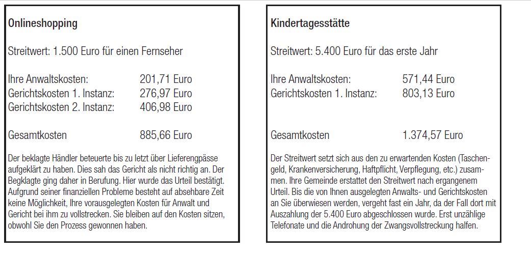 Wer selbst noch keinen Rechtsstreit führen musste, hat in der Regel keinerlei Vorstellungen davon, wie teuer so eine Auseinandersetzung werden kann. Grundsätzlich weiß man zwar irgendwie, das man für den Anwalt zahlen muss, Gebühren bei Gericht, Zeugengeld, Sachverständigenkosten, etc. – aber mehr als eine grobe Ahnung hat man bei den Kosten nicht., wenn man ehrlich ist. Zum Abschluss möchten wir Ihnen daher gerne noch die Kosten zu einigen der vorangegangenen Beispiele präsentieren. Letztlich geht es immer nur um Euro und Cent.